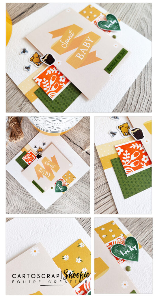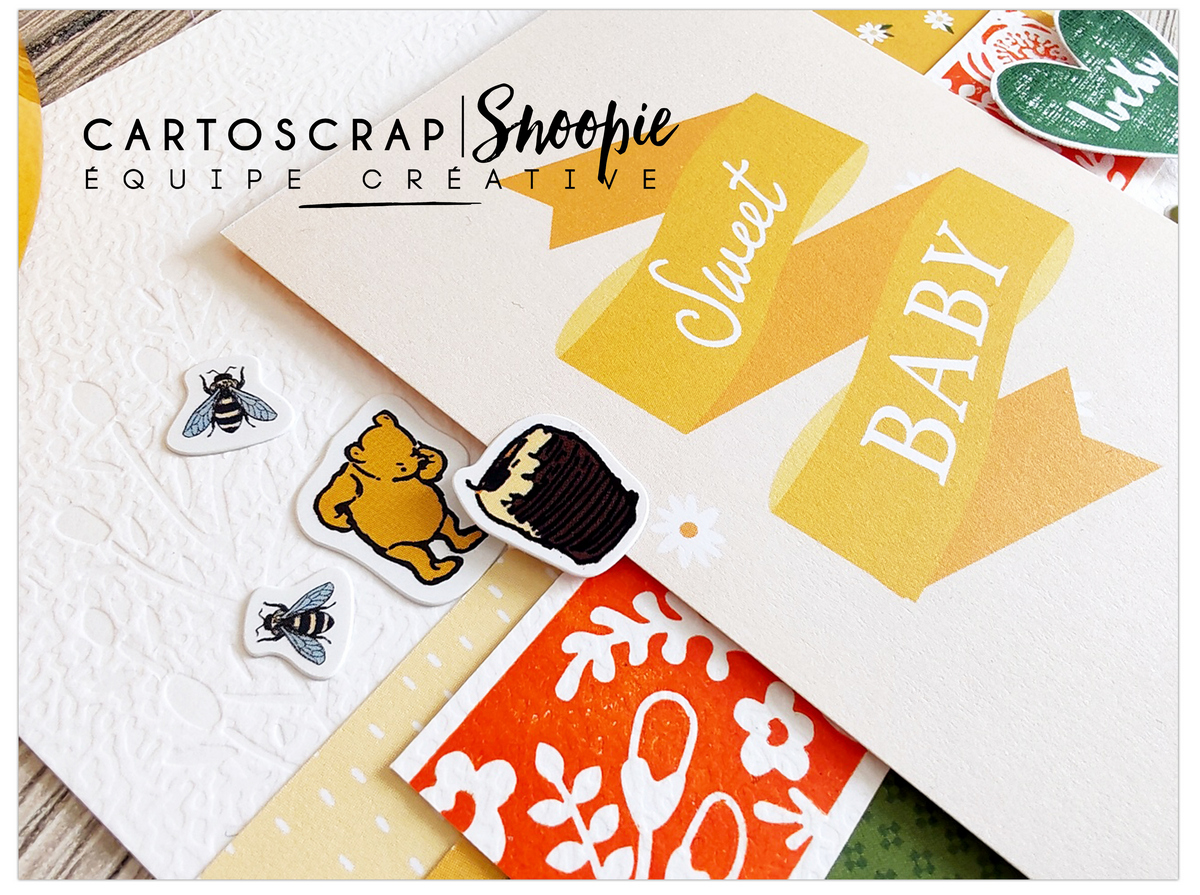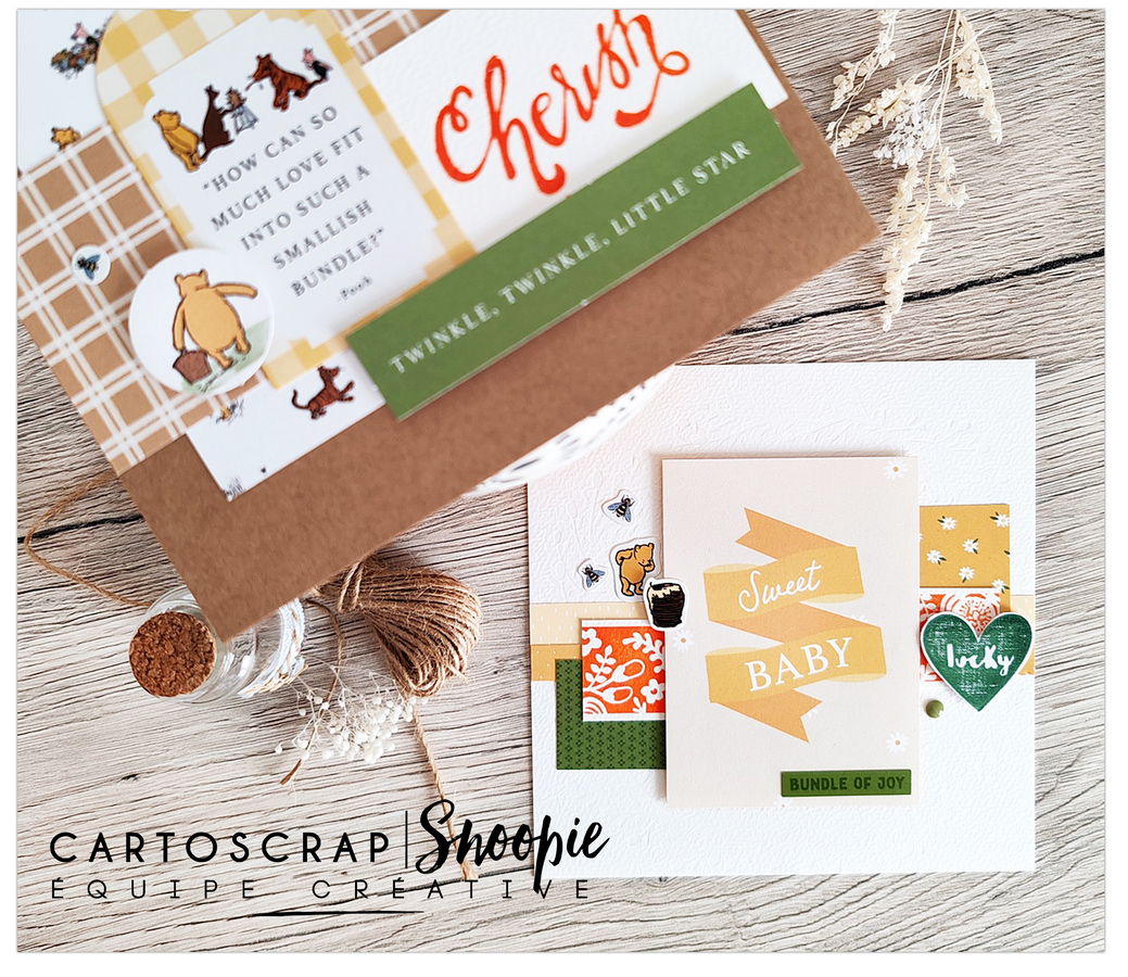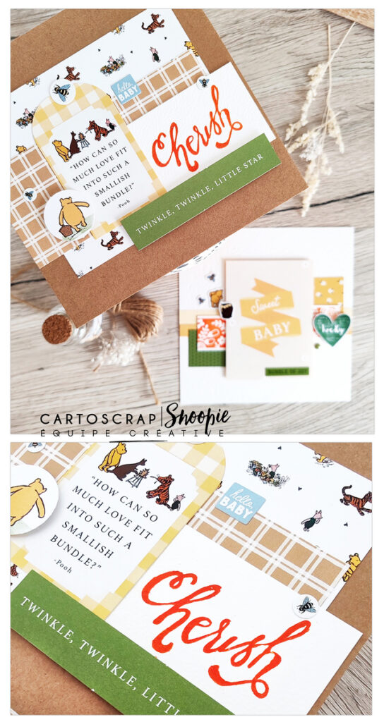 Pour la décoration, j’ai utilisé des papiers, stickers et die-cuts de la collection Winnie l’ourson d’Echo Park. Les petits personnages apportent immédiatement de la tendresse et un esprit enfantin, sans tomber dans le trop “bébé”. C’est ce genre de détails qui donnent vie à une carte et la rendent vraiment attachante.