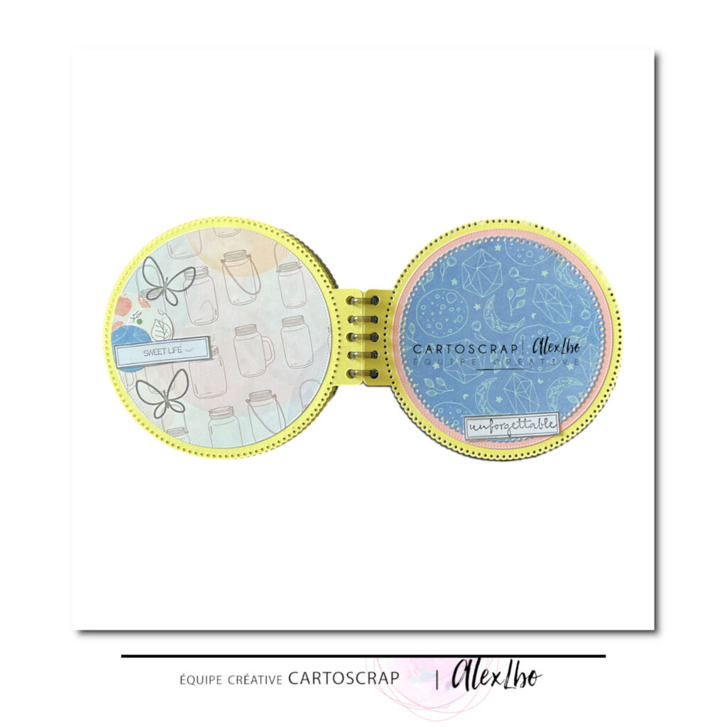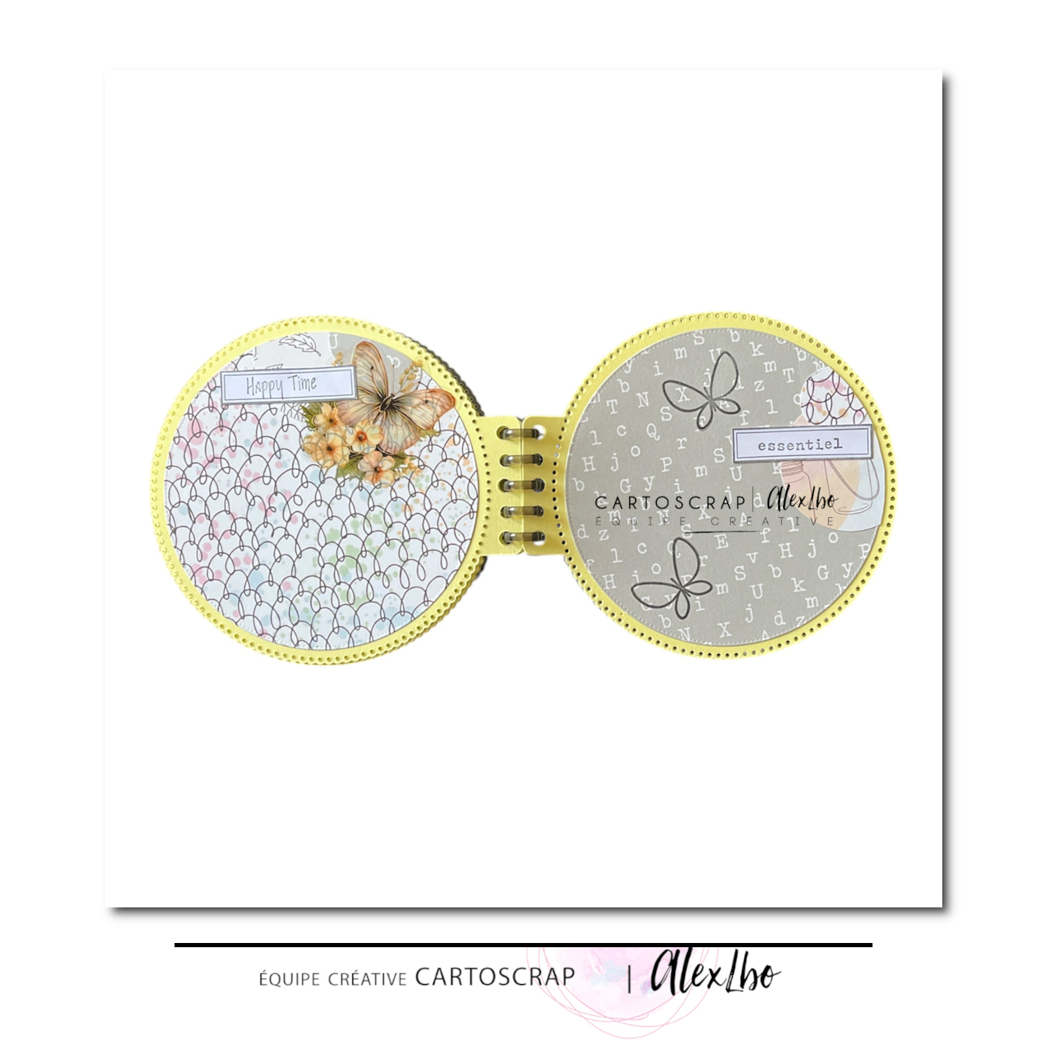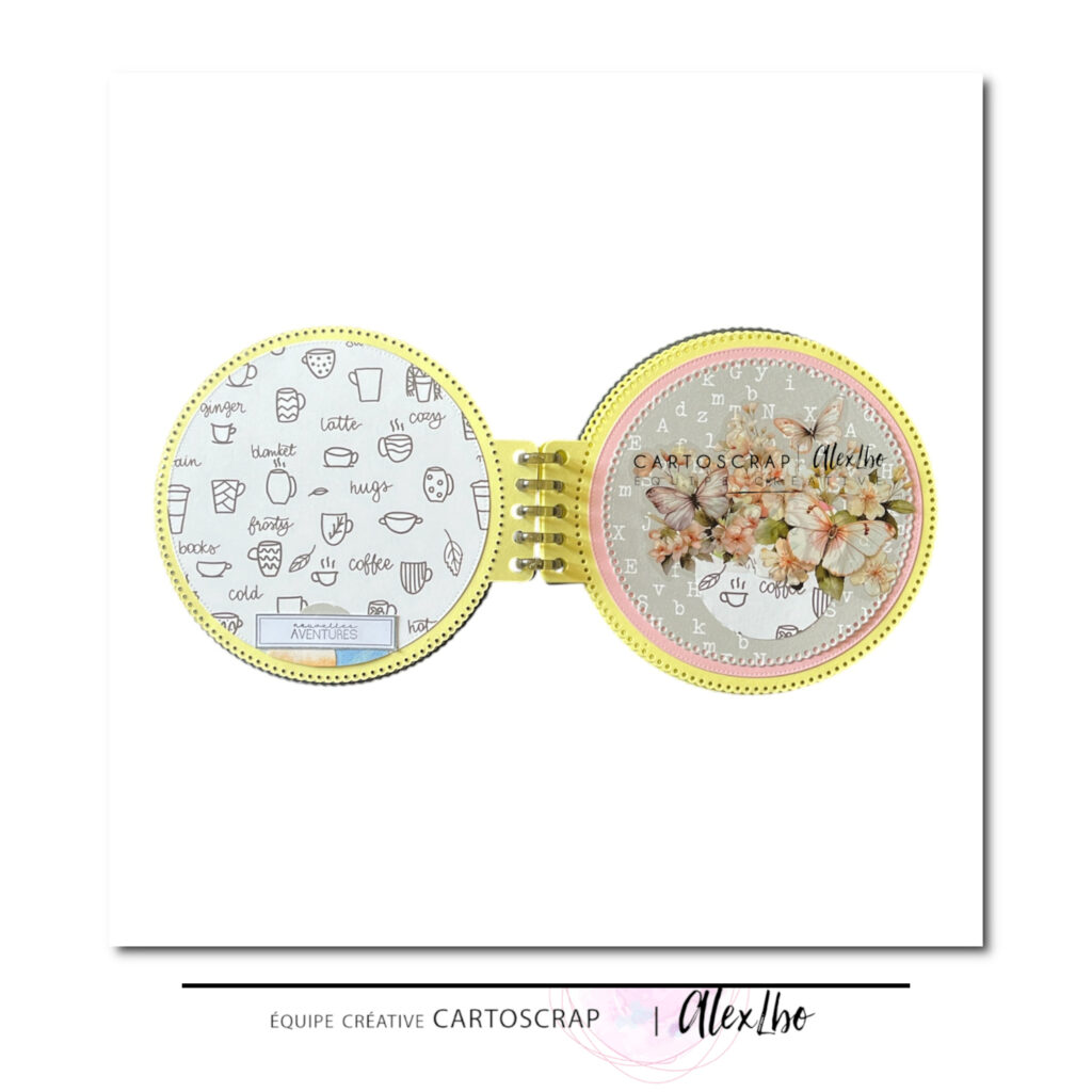 Pour ce projet, j’ai eu envie de jouer avec les formes et de sortir des formats classiques. J’ai donc opté pour un format rond, réalisé à l’aide d’un die pour les pages, qui apporte immédiatement beaucoup de douceur et d’originalité à l’album.