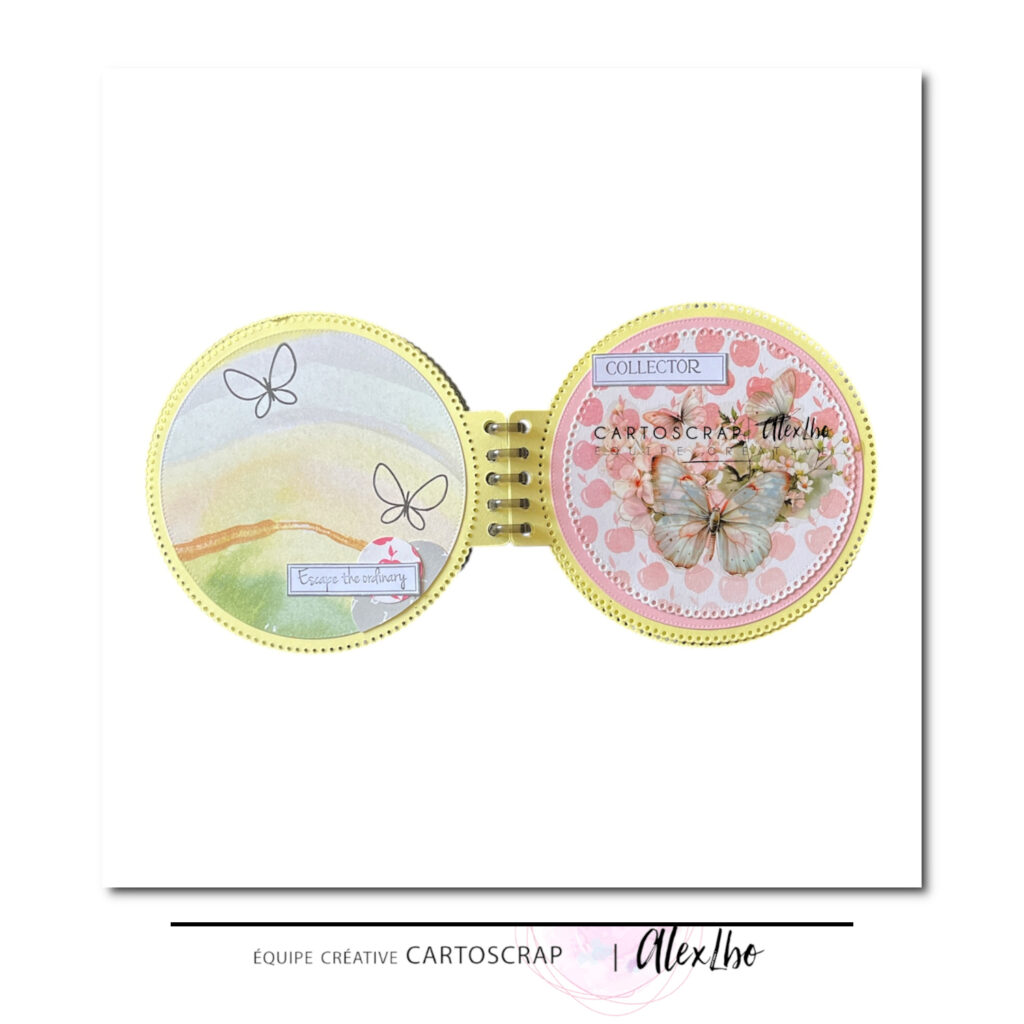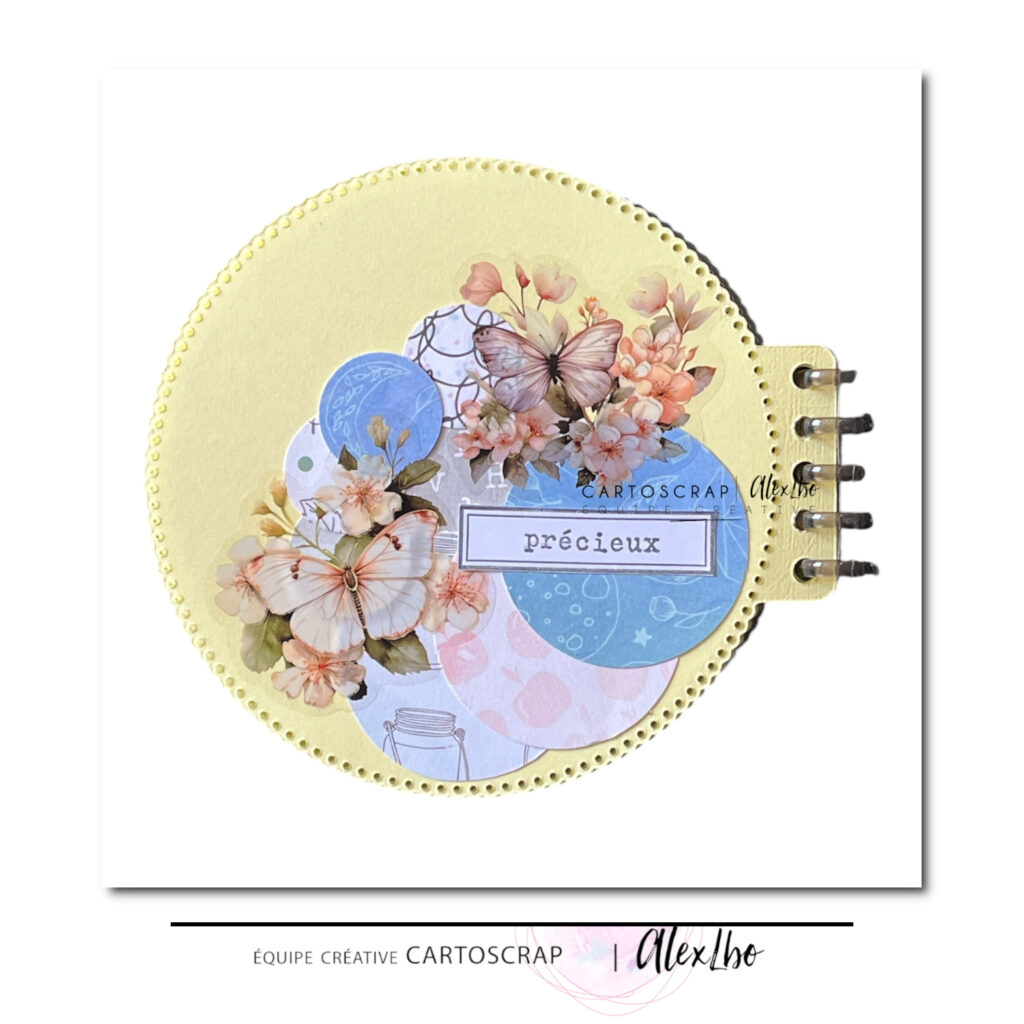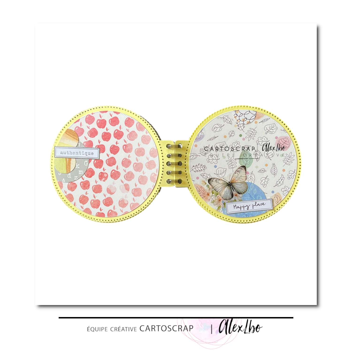 Pour ce projet, j’ai eu envie de jouer avec les formes et de sortir des formats classiques. J’ai donc opté pour un format rond, réalisé à l’aide d’un die pour les pages, qui apporte immédiatement beaucoup de douceur et d’originalité à l’album.