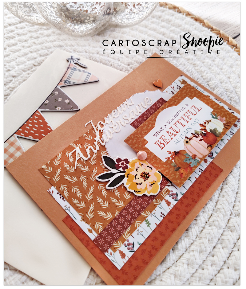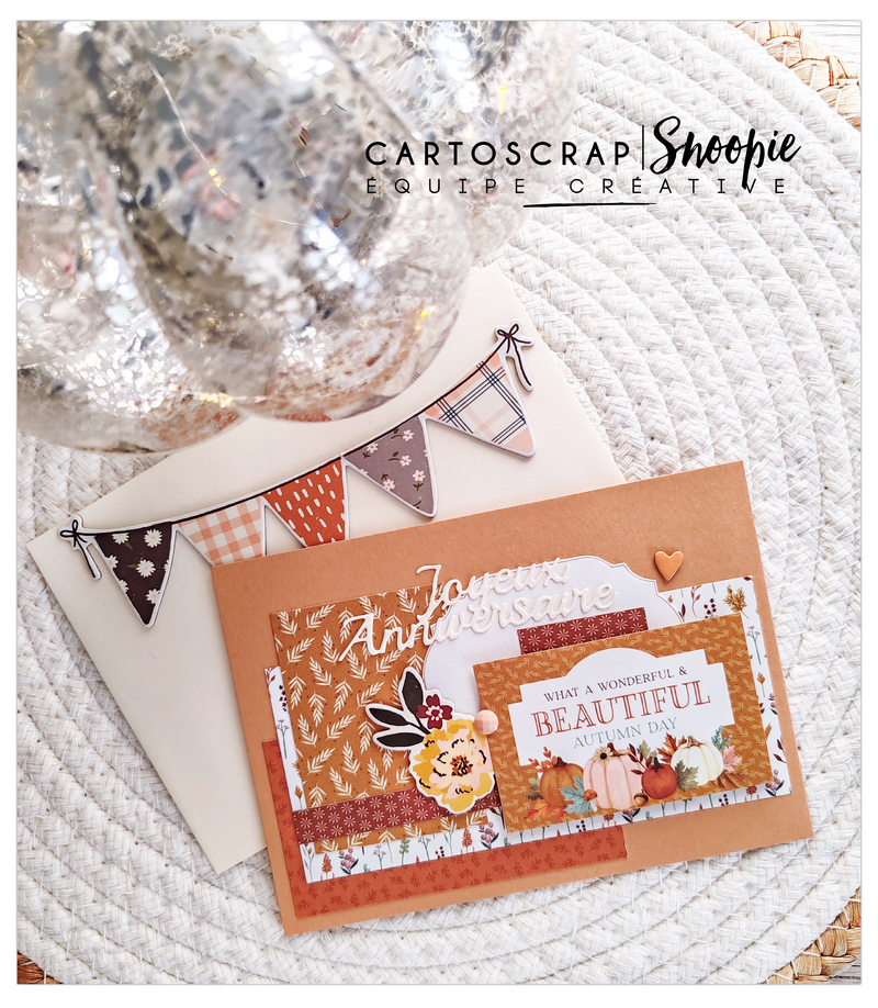 Voici une petite carte automnale dans des tons chaleureux avec des papiers et éléments de saison.