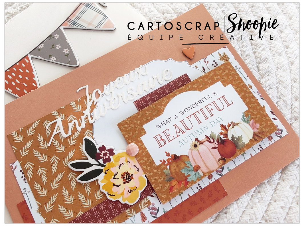 Voici une petite carte automnale dans des tons chaleureux avec des papiers et éléments de saison.