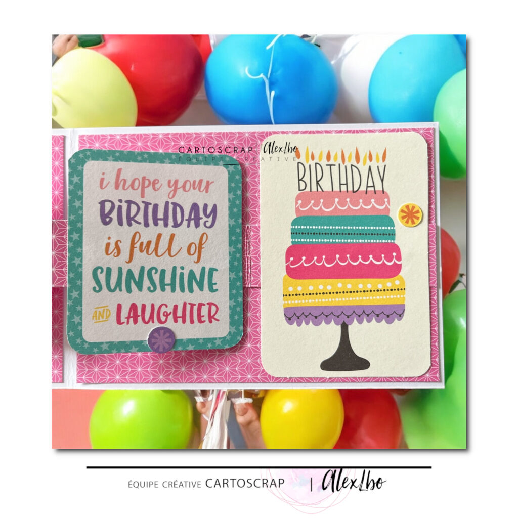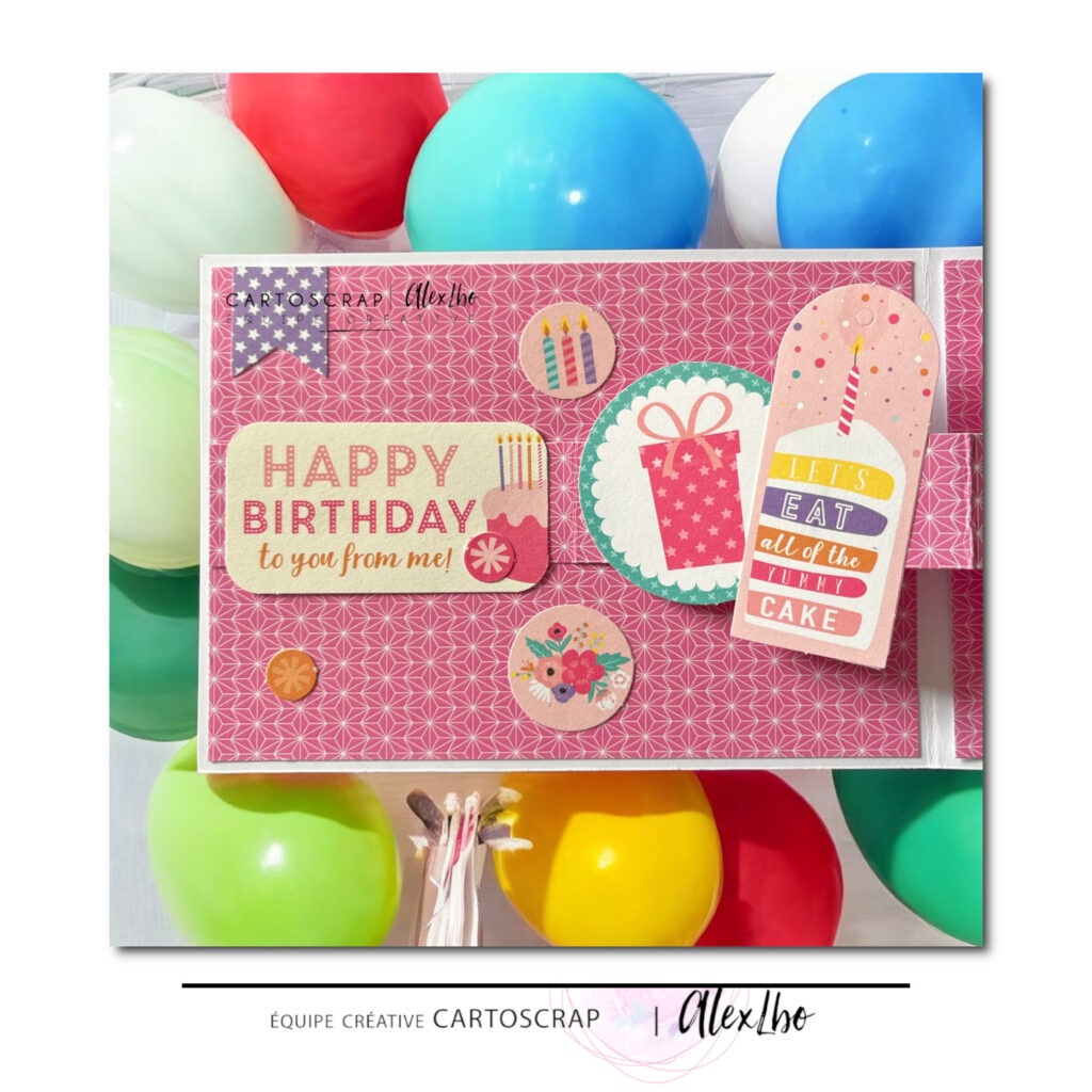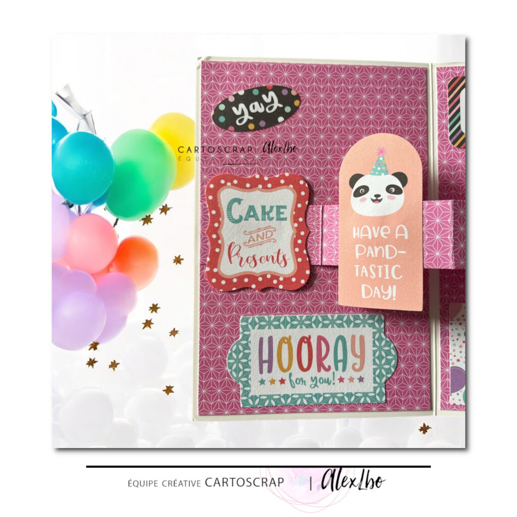 La seconde création suit le même principe : un univers joyeux, lumineux et rempli de bonne humeur grâce aux embellissements Echo Park. Chaque détail (ballons, bannières, personnages) contribue à transmettre un esprit de fête et rend la carte unique.