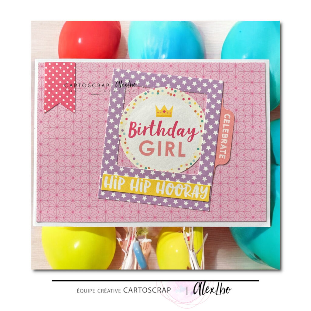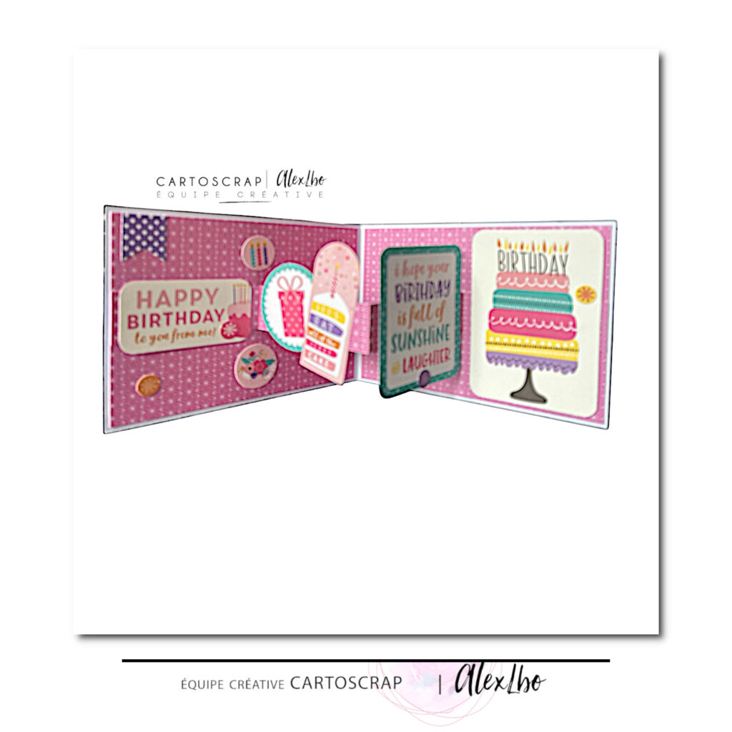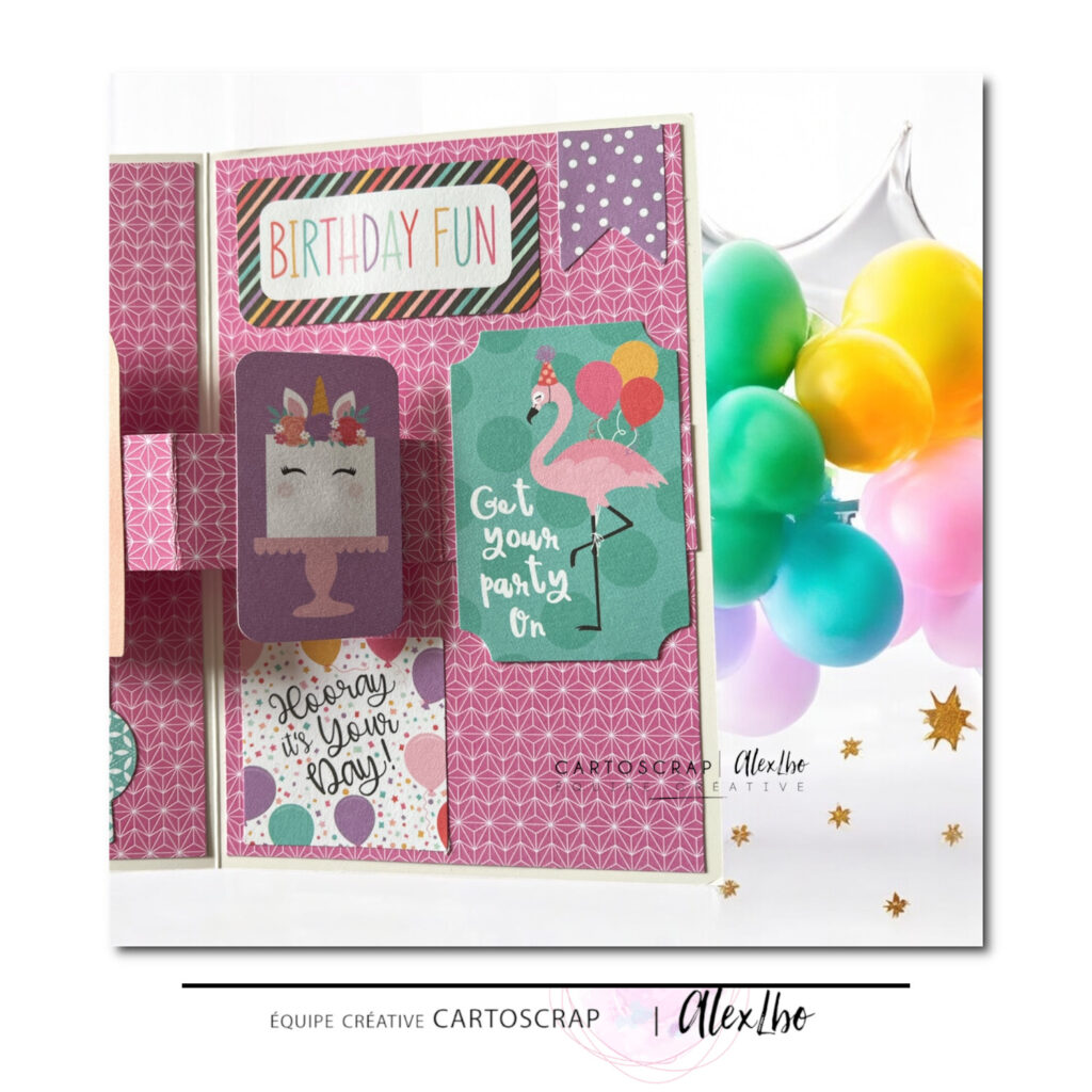 La seconde création suit le même principe : un univers joyeux, lumineux et rempli de bonne humeur grâce aux embellissements Echo Park. Chaque détail (ballons, bannières, personnages) contribue à transmettre un esprit de fête et rend la carte unique.