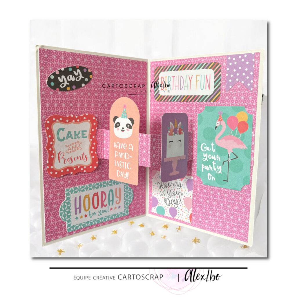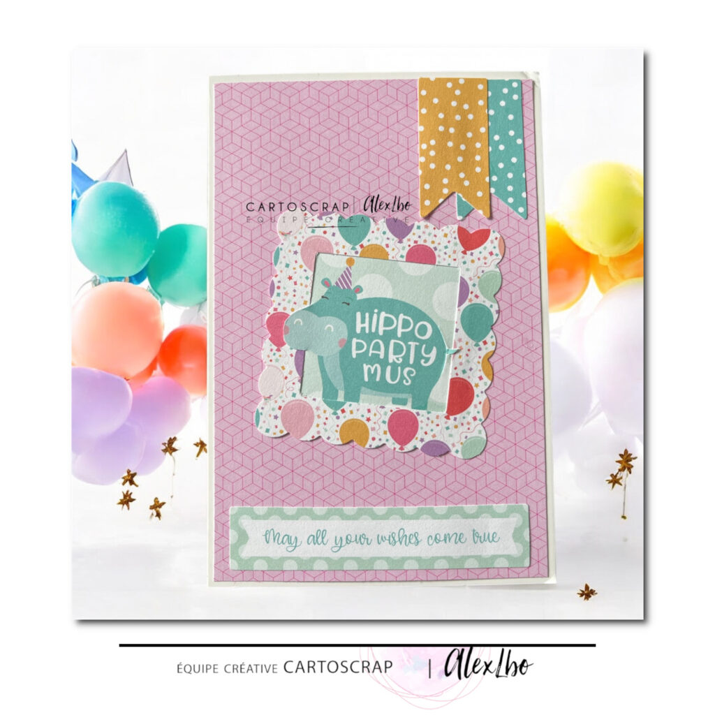 Sur un fond graphique, j’ai mis en valeur un adorable hippopotame en fête entouré de ballons colorés. Le die cut central est mis en relief et accompagné de petites bannières pour accentuer le côté festif. À l’intérieur, le pop-up apporte une véritable dimension supplémentaire, idéale pour célébrer un anniversaire de façon originale.