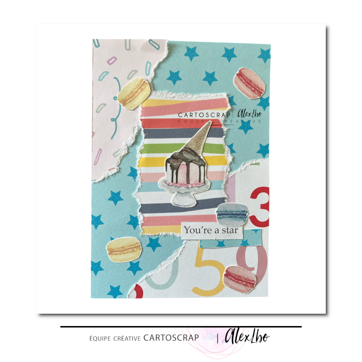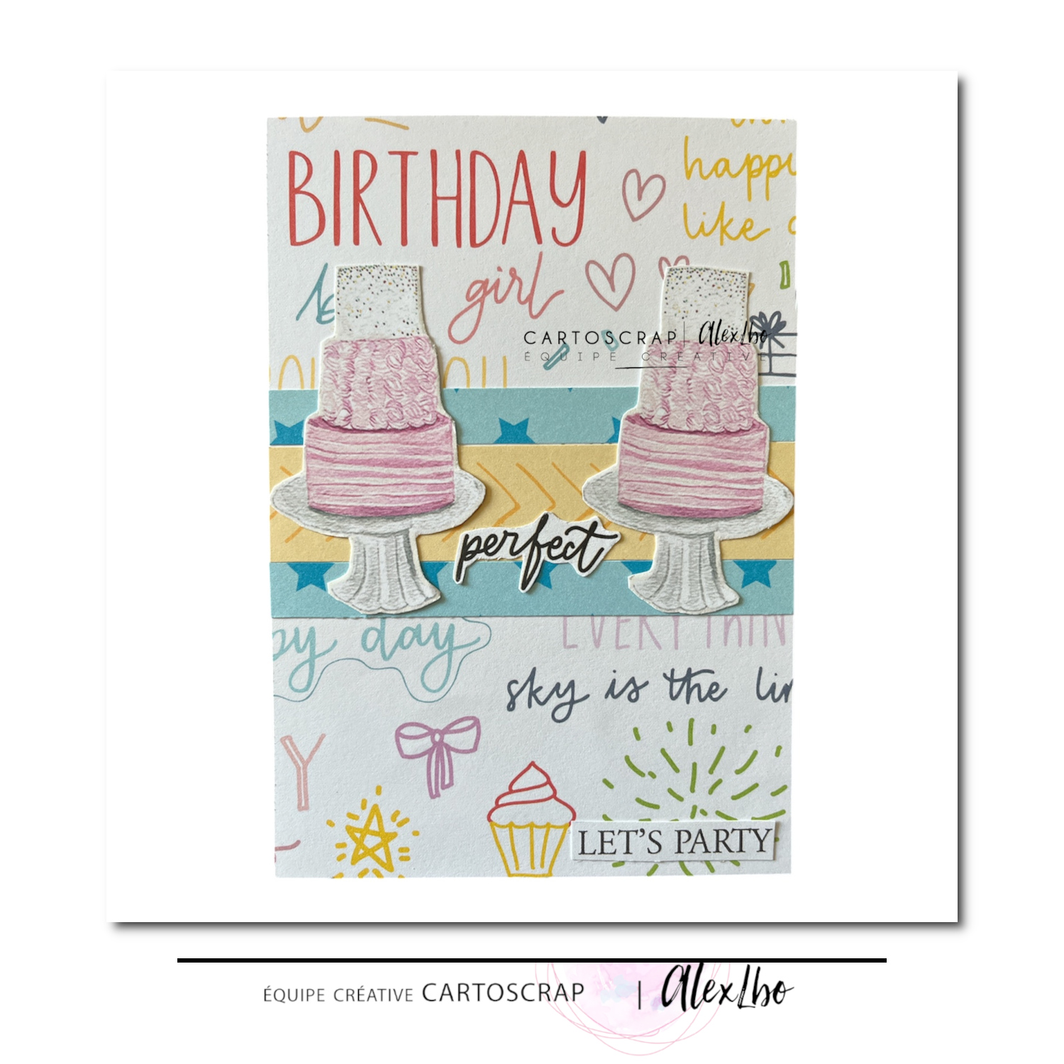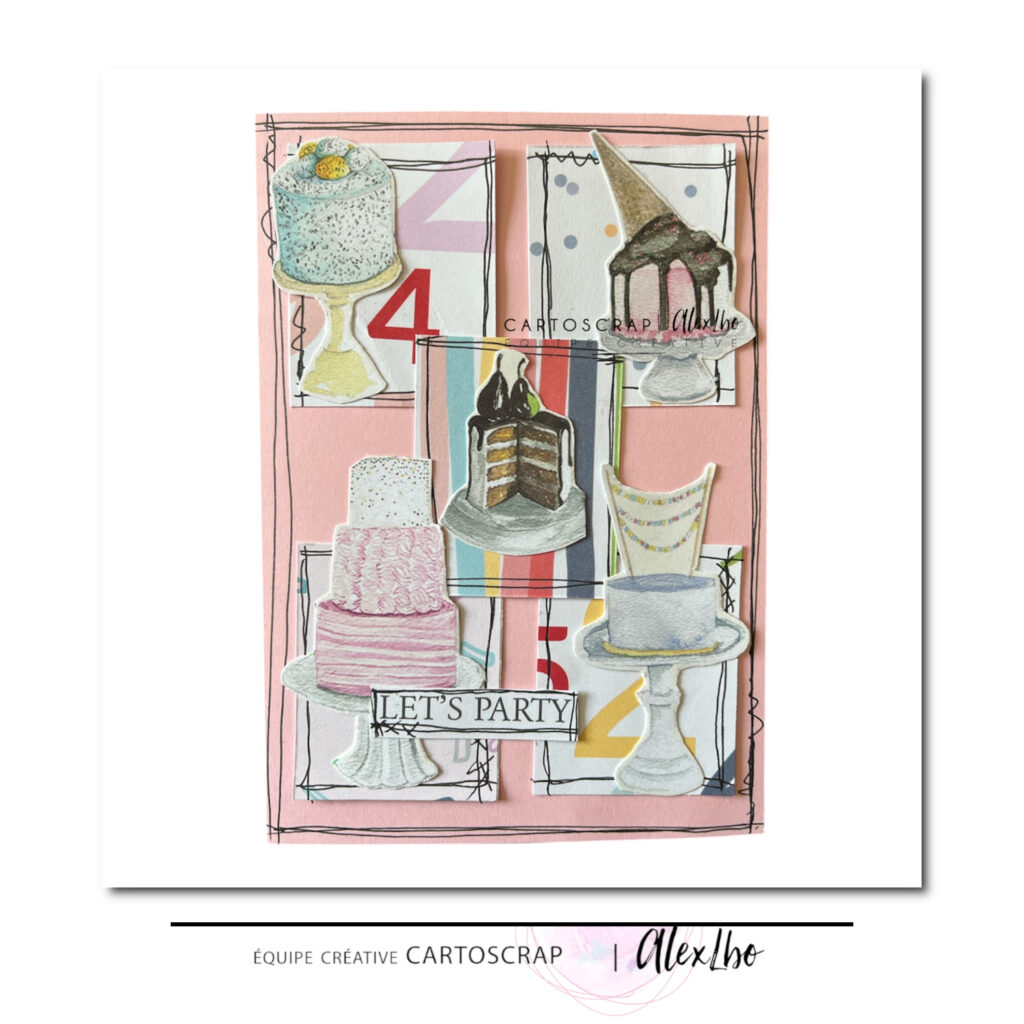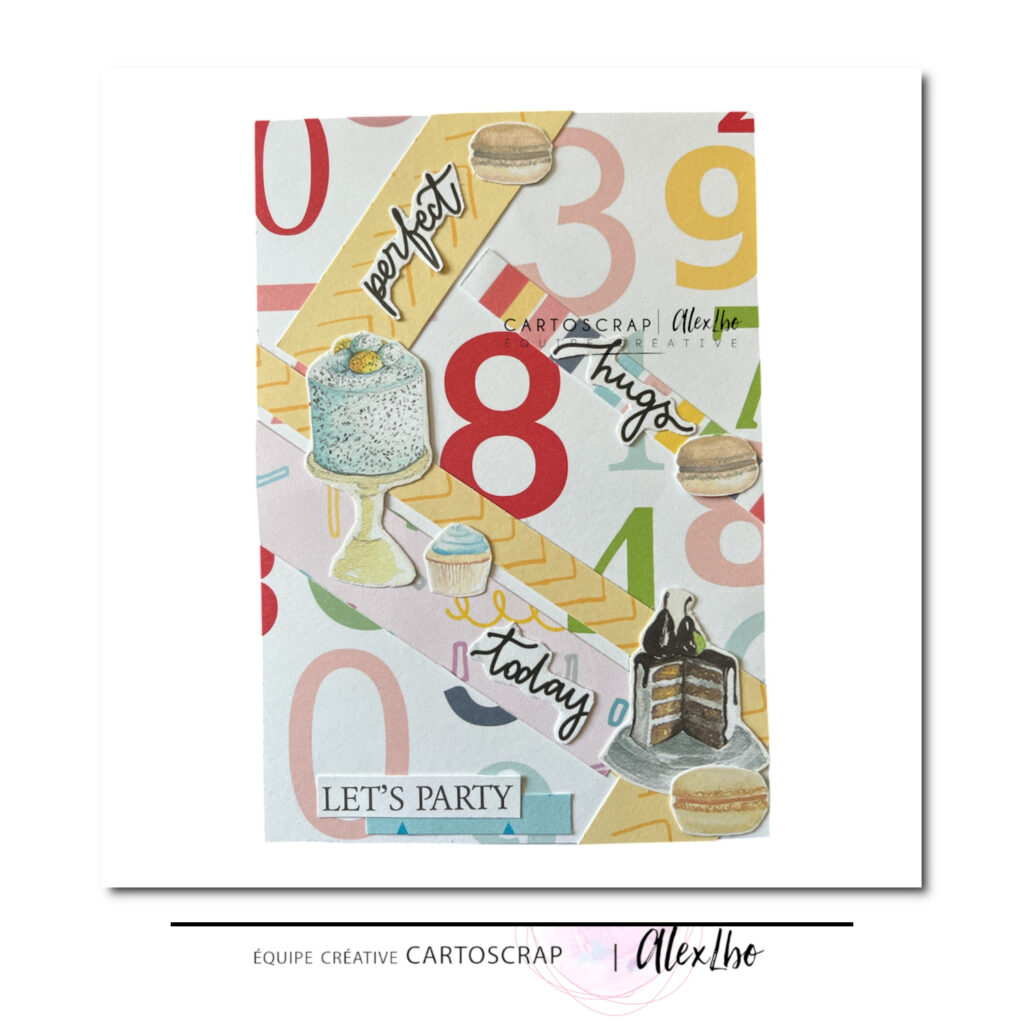 Pour ce projet, j’ai travaillé avec la collection Let’s Party de Studio Forty, disponible en boutique Cartoscrap. Une collection pleine de pep’s, aux motifs festifs et gourmands, parfaite pour créer des cartes d’anniversaire joyeuses et pleines de bonne humeur.
