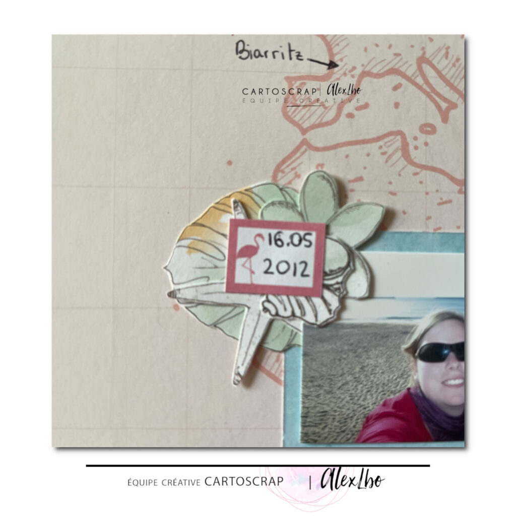 Je vous propose donc une page sur le thème de l’été, de la plage avec un phare, des coquillages et des fleurs sur fond de carte du monde.
