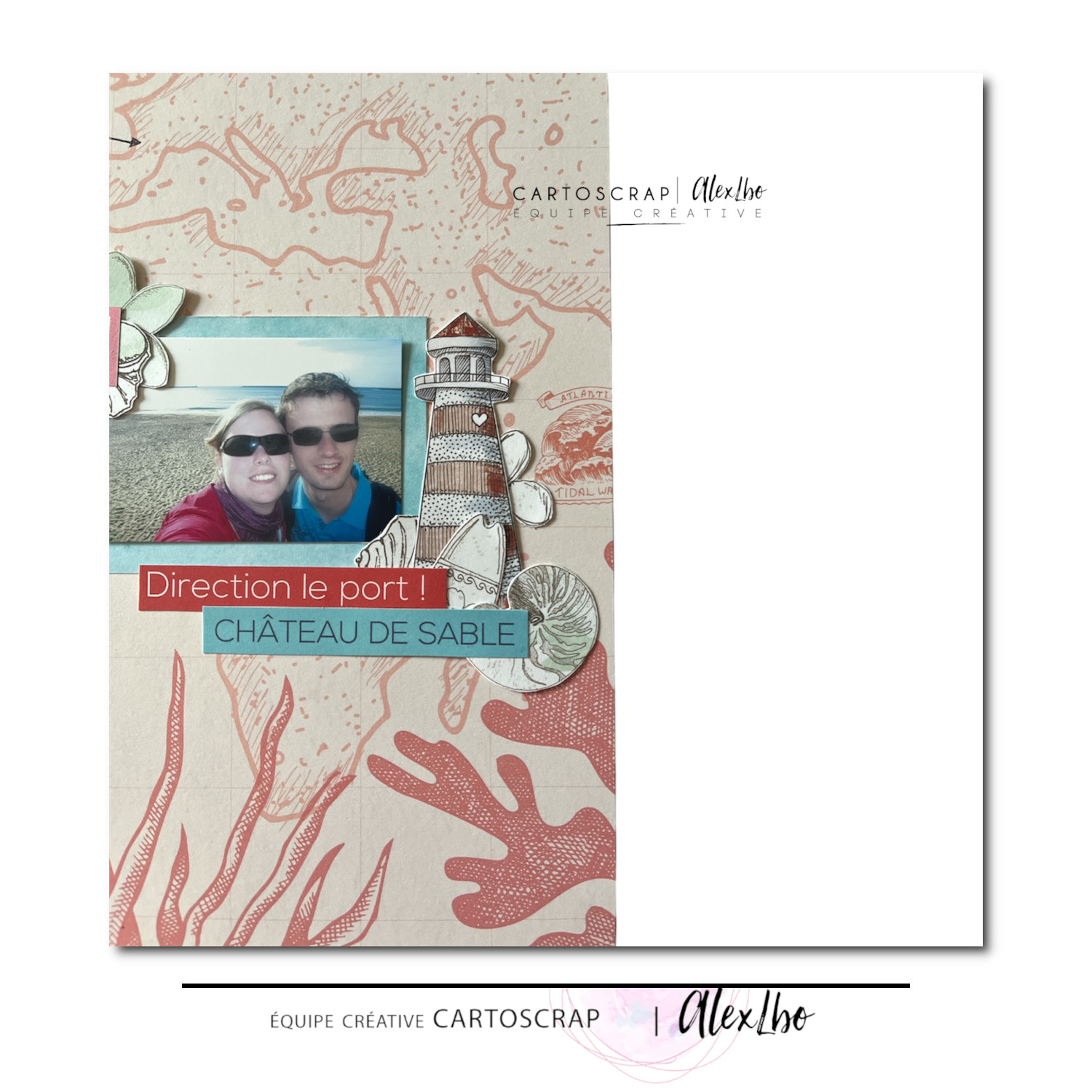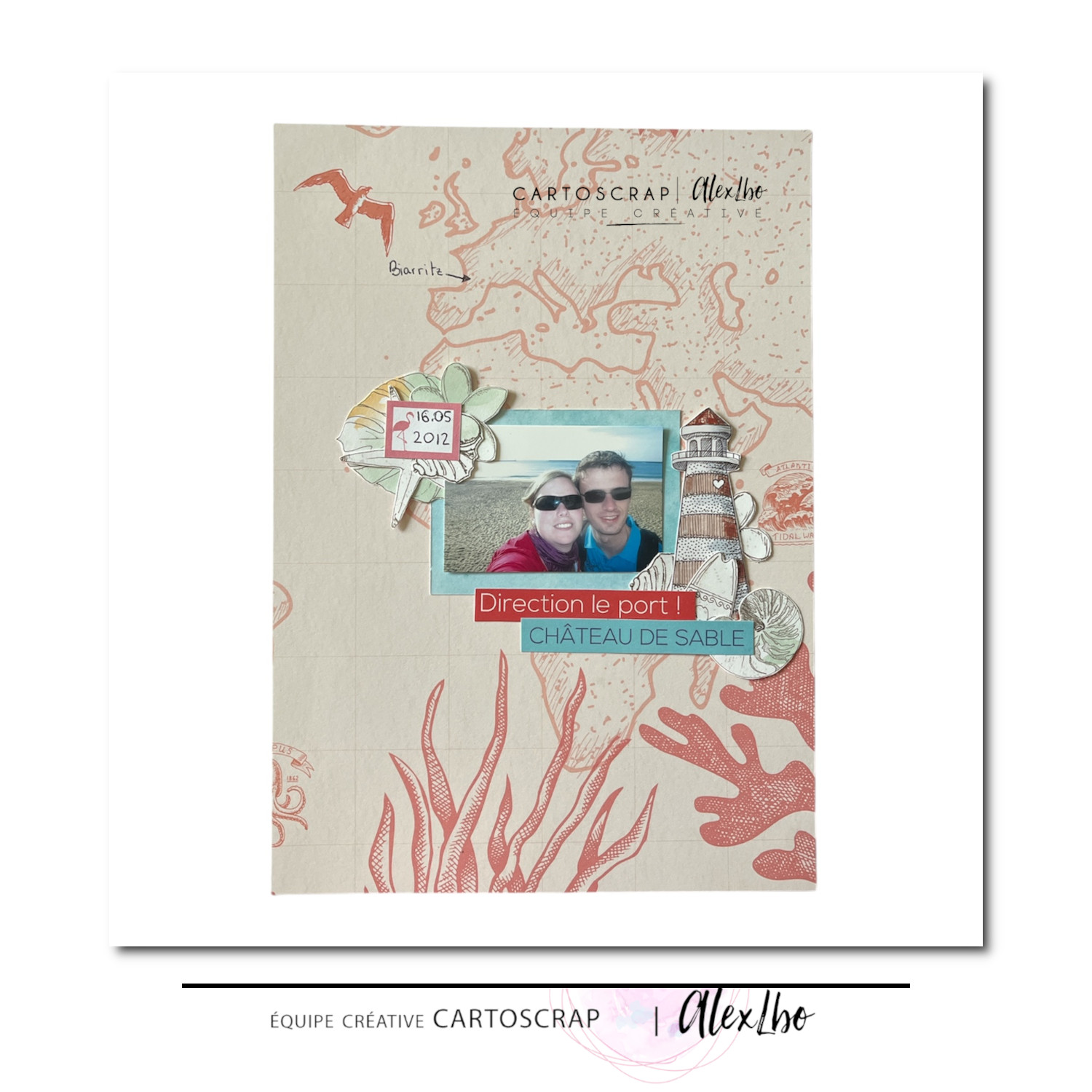 Je vous propose donc une page sur le thème de l’été, de la plage avec un phare, des coquillages et des fleurs sur fond de carte du monde.