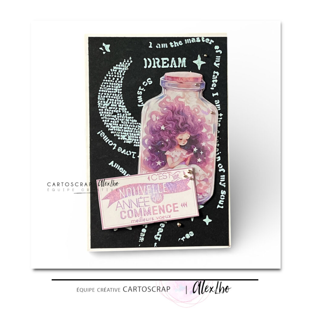 Pour le fond de carte, j’ai utilisé de la pâte de texture associée à un pochoir afin de créer du relief et donner de la profondeur à l’ensemble. Une fois la pâte sèche, le fond révèle de jolis motifs subtils qui accrochent la lumière et mettent en valeur le reste de la composition. Le contraste avec le fond sombre accentue encore plus le côté mystérieux et rêveur de la carte.