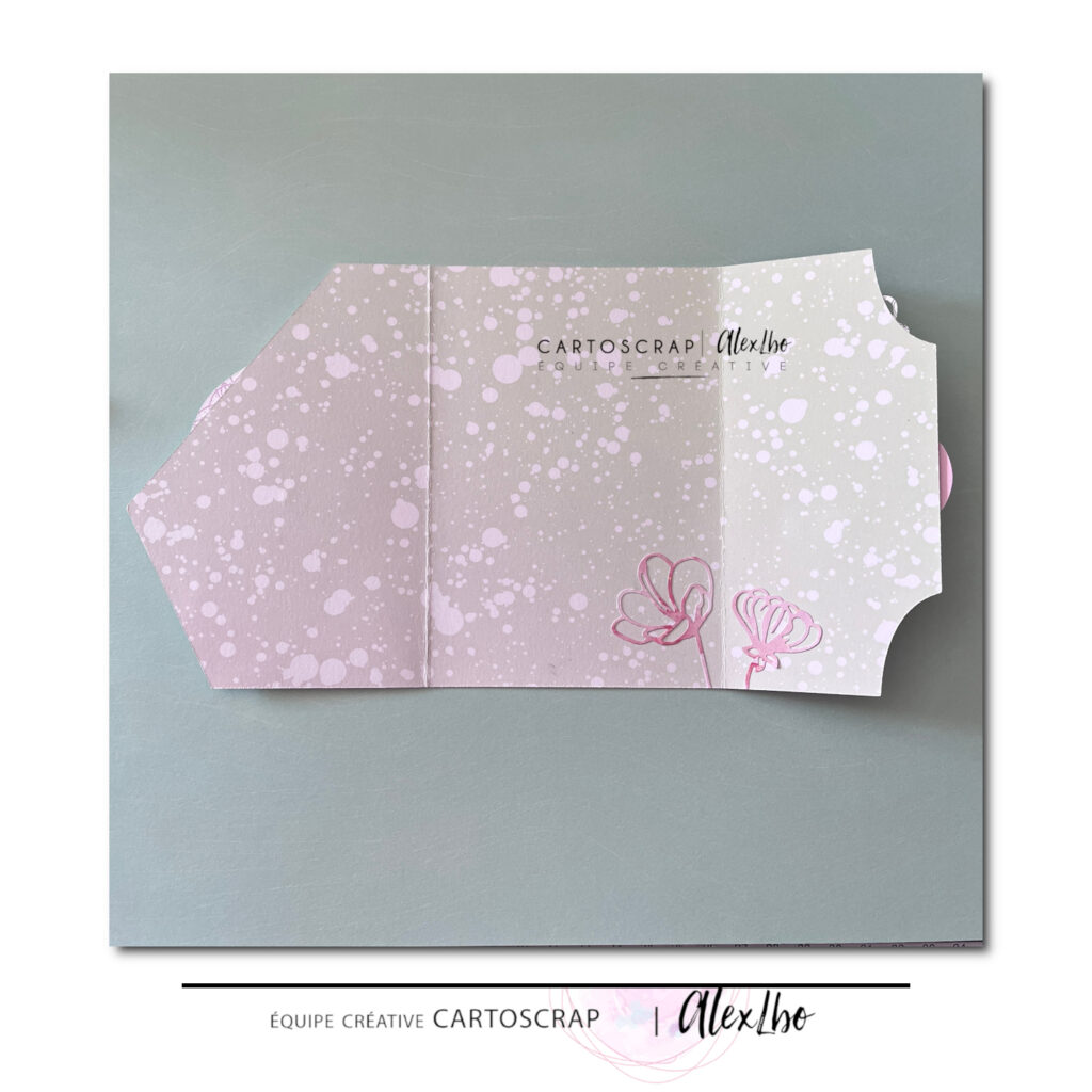 Pour cette création, j’ai choisi de réaliser une carte avec une ouverture un peu originale puisqu’elle s’ouvre en trois volets. Les plis asymétriques permettent de créer un effet graphique tout en laissant apparaître progressivement les différents éléments de la carte.
