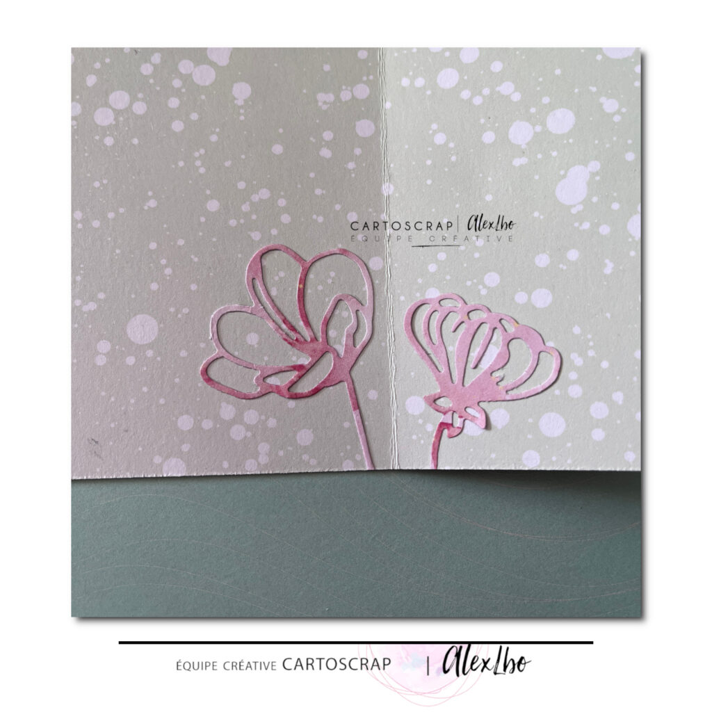 Pour apporter du relief et une touche naturelle, j’ai ajouté une découpe issue des dies Fleurs des champs. J’aime beaucoup la finesse de ces découpes végétales qui s’intègrent facilement dans de nombreuses compositions et apportent beaucoup d’élégance aux créations.